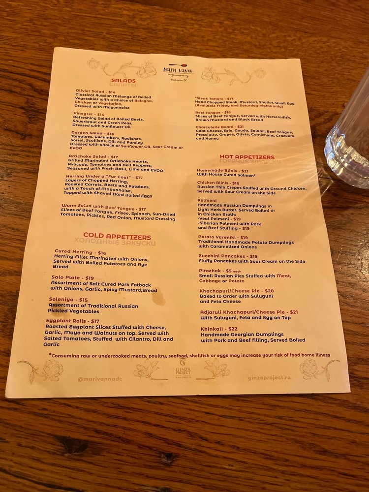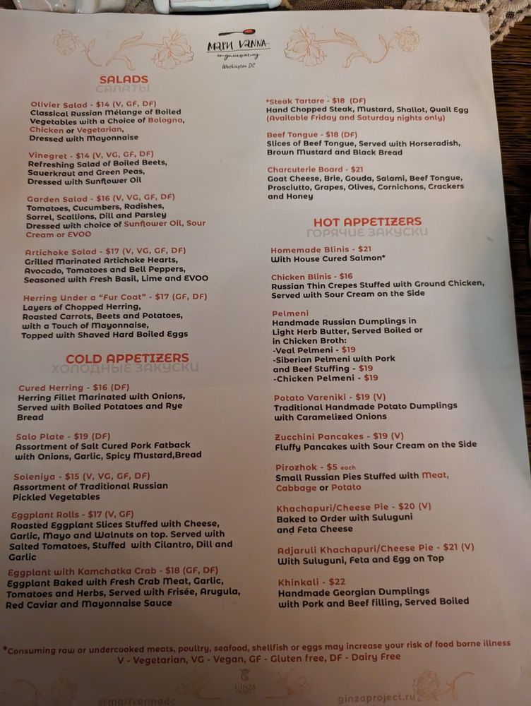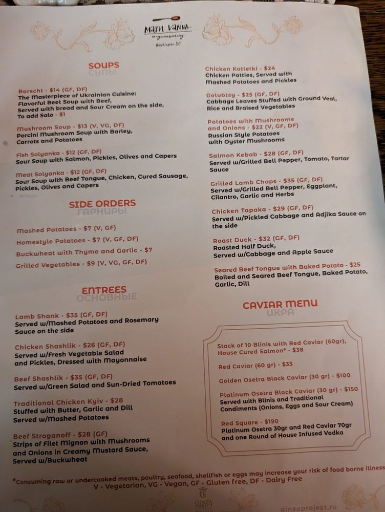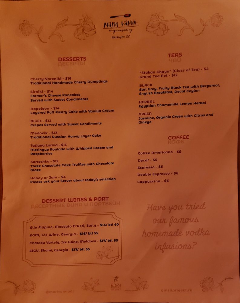 Introducing Mari Vanna, a modern European-Russian restaurant in Washington, DC that offers a cozy and authentic dining experience. With a range of vegan and vegetarian options, Mari Vanna caters to a diverse palate while providing a warm and welcoming atmosphere. Customers praise the quick service, comfortable interior, and delicious dishes like Borsch Soup, Potato Varenki, Beef Stroganoff, and Lamb Shank. The decor is charming, reminiscent of a grandmother's house, creating a unique and inviting ambiance. While some desserts may fall short, the overall dining experience at Mari Vanna is delightful. Explore infused vodka flavors and traditional Russian dishes in a setting that transports you to Eastern Europe. Don't miss out on the opportunity to taste the flavors of Mari Vanna for a truly memorable dining experience.